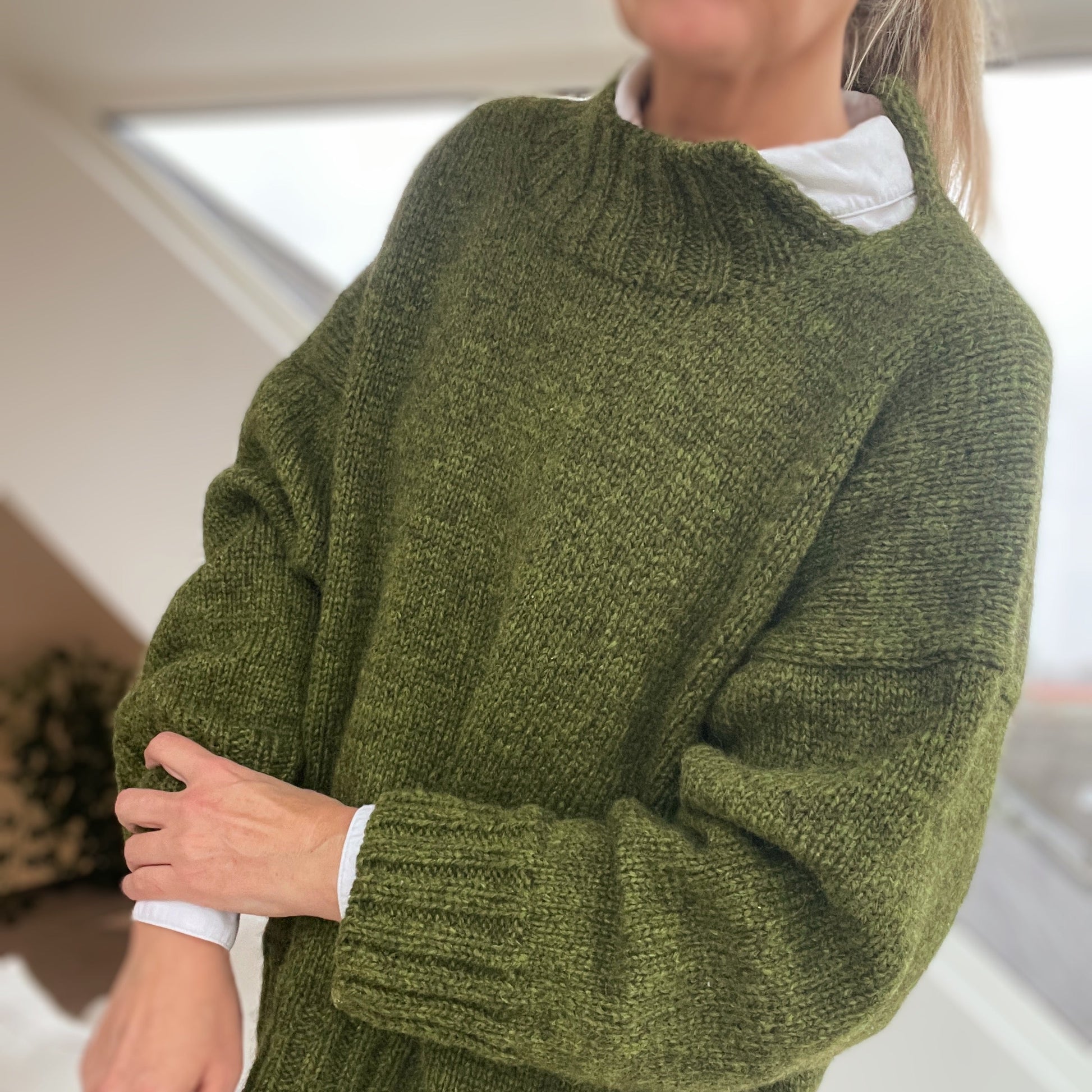 Ida Sweater is worked top down in stockinette stitch. Stitches are cast on using a provisional (open) cast-on. First, the upper part of the back is worked, then the shoulders of the front are worked — one shoulder at a time. The neckline is then shaped, and the two front sections are joined to form the front. At the armholes, the front and back are joined, and the body is worked in the round to the bind-off. Sleeve stitches are picked up directly from the armholes. The same applies to the stitches for the ribbed neckline, which are picked up around the neck opening.